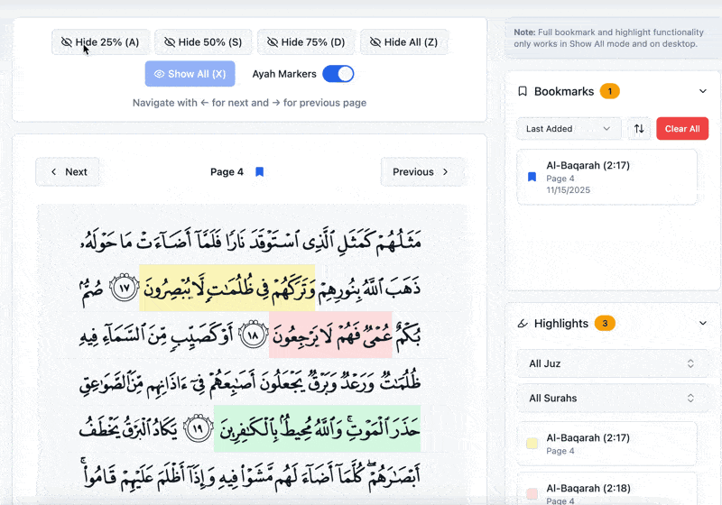 Strengthen your hifz by training your eyes on the layout of each page through dynamic hiding, showing, and highlighting.