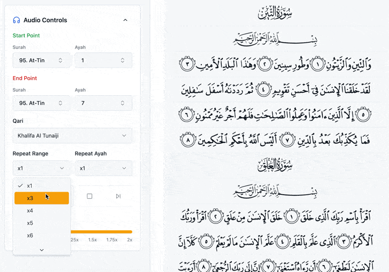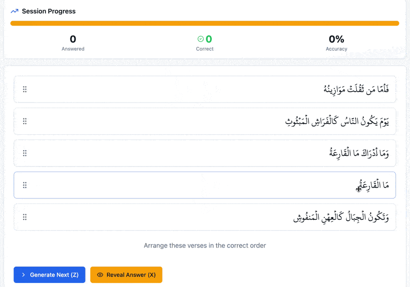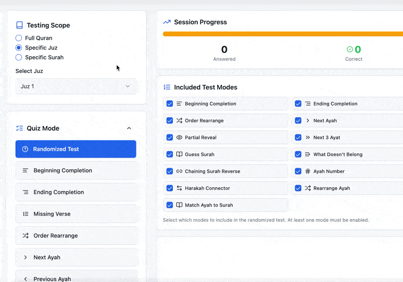 Practice at your level with flexible test modes that let you review a few ayat, a surah, a juz, or even the whole Quran.