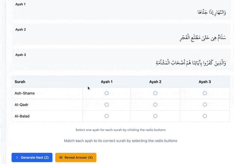 Deepen recognition by matching ayah to their surah so your memorization becomes strong and anchored.